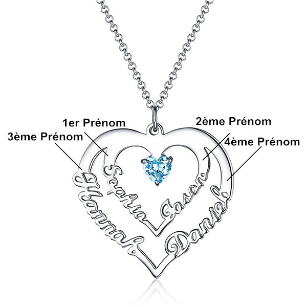 2. Collier Cœur d'Amour-4 Prénoms et Pierres de Naissance-Argent