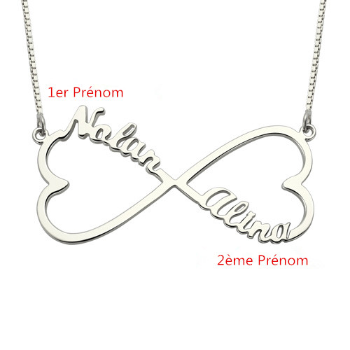 Collier Personnalisé 2 Cœurs & Prénoms Infini en Argent - La meilleure façon de dévoiler ce que le mot « l'éternité» signifie pour vous. Au maximum deux prénoms ou mots significatifs sur chaque boucle du symbole de l’infini. C'est le collier prénom infini personnalisé idéal à porter. Vous pouvez graver les prénoms de vos meilleurs amis, ceux de vos enfants ou tout ce que vous pouvez imaginer.