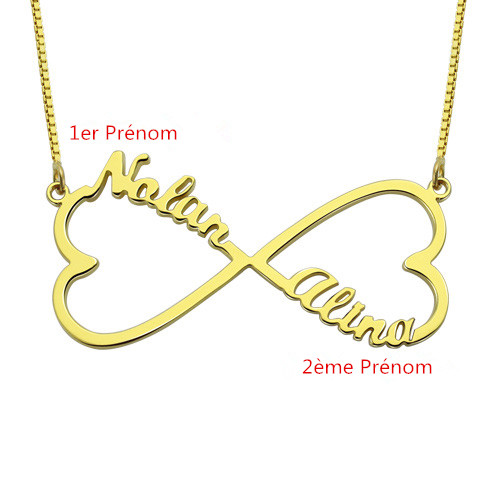 Collier Personnalisé 2 Cœurs & Prénoms Infini - La meilleure façon de dévoiler ce que le mot « l'éternité» signifie pour vous. Au maximum deux prénoms ou mots significatifs sur chaque boucle du symbole de l’infini. C'est le collier prénom infini personnalisé idéal à porter. Vous pouvez graver les prénoms de vos meilleurs amis, ceux de vos enfants ou tout ce que vous pouvez imaginer.
