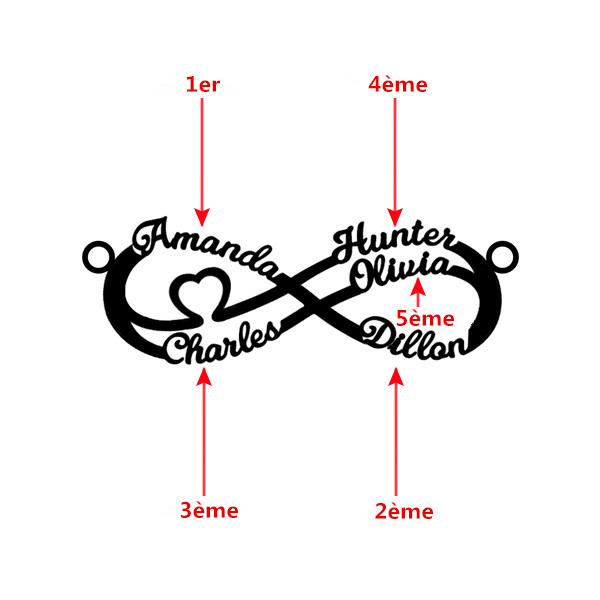 Nouveau design de 5 prénoms, ce collier infini est parfait pour les mères qui ont beaucoup d'enfants. C'est également un collier d'arbre de famille, mais il n'est pas en forme d'arbre cette fois-ci, il est le symbole d'Infini qui signifie l'affection interminable entre les membres de famille. Nous pouvons graver au maximum 5 prénoms pour ce pendentif, et un prénom devrait moins de 7 lettres. Ce bijou sera le cadeau parfait pour la fête des mères ou le Noël, ou bien l'anniversaire de votre mère.