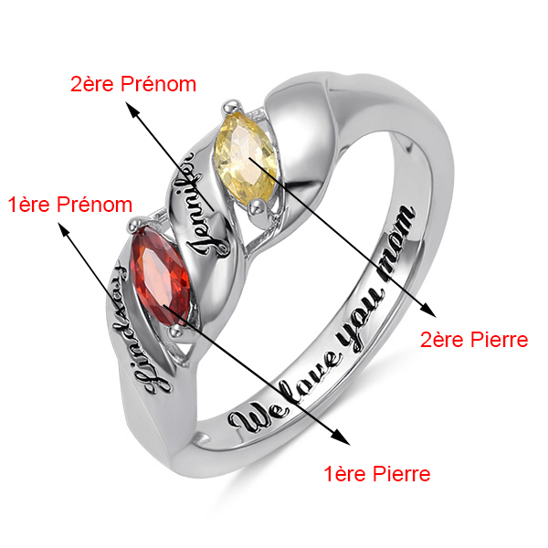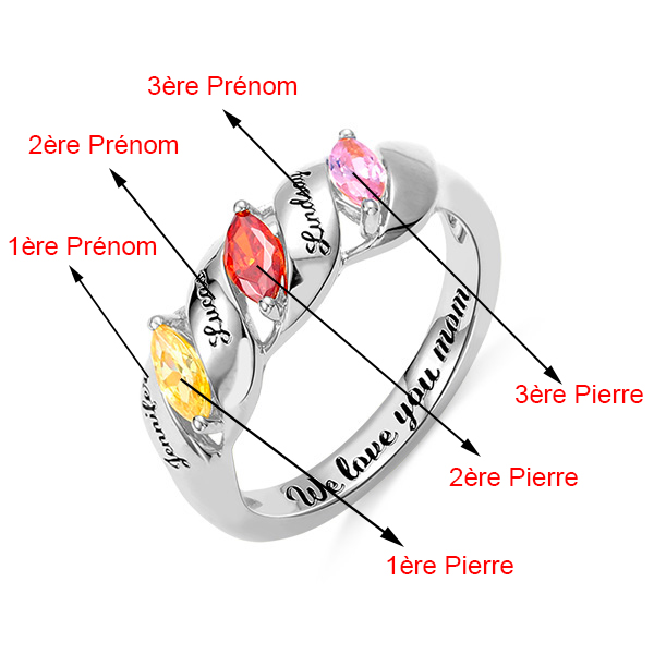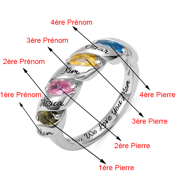 Notre série de bagues avec pierres de naissance sont de haute qualité, sur les quelles nous gravons des prénoms correspondant à chaque pierre, mais aussi une petite phrase au maximum 20 caractères pour l'intérieur d'anneau. En plus, vous pouvez choisir la couleur de chaque pierre. Cadeau vraiment idéal pour mères, grands-mères, soeurs ou amies. Alors dépêchez-vous. Que ces bijou sont magnifiques, brillantes et spéciales !