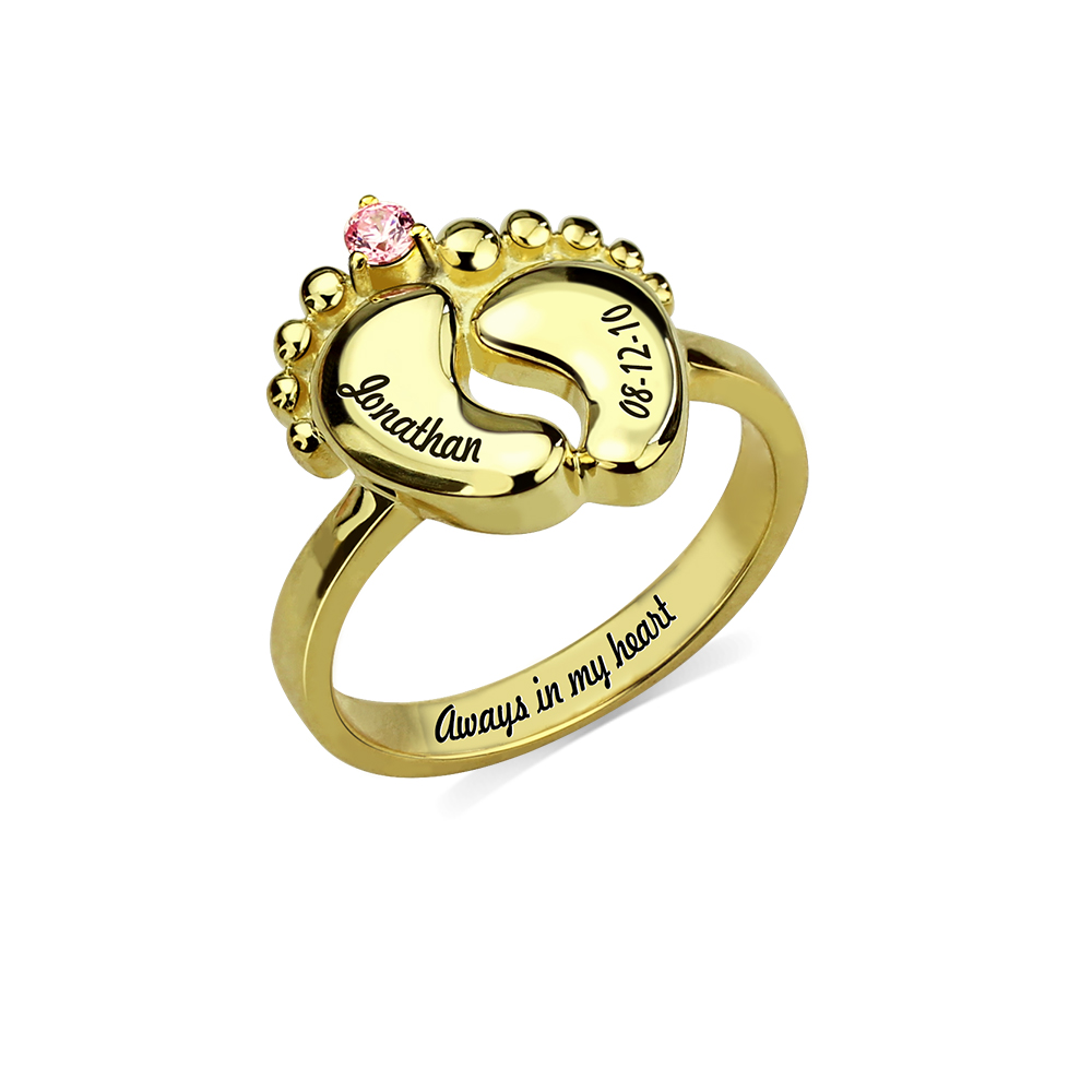 Cette bague plaquée Pieds de Bébé & pierre porte-bonheur est le meilleur cadeau pour les maman. Vous pouvez graver n'importe quels mots ou date sur chaque pied et une phrase de votre choix à l’intérieur de la bague. Un cadeau parfait et toujours convenable pour un de vos proches.