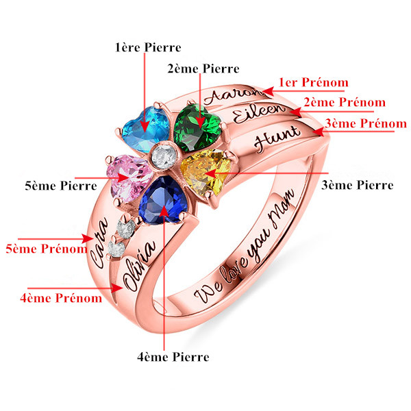 2. Bague Cœur-5 Prénoms et Pierres de Naissance-Plaqué Or Rose