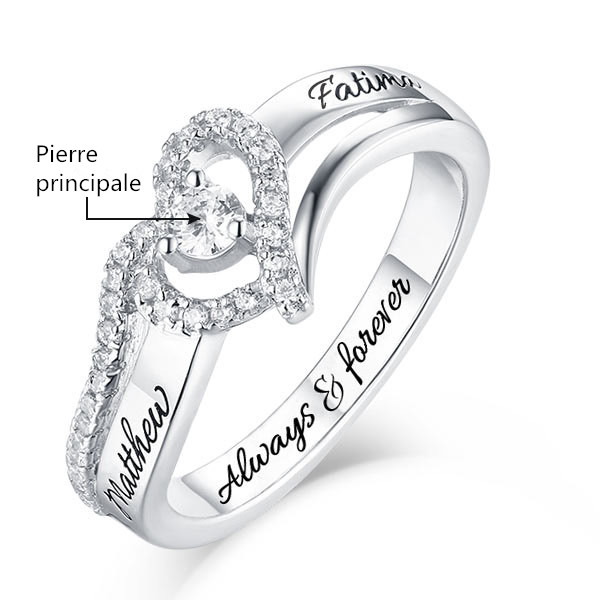 Bague classique et personnalisable pour exprimer votre amour éternel, au centre de la quelle nous instrutons une pierre brillante dont vous pouvez choisir la couleur, sera le cadeau parfait pour votre amoureuse. Nous pouvons graver deux prénoms sur deux côté de pierre de naissance et des mots doux sur l'intérieur de bague. Que ce bijou est joli et significatif !